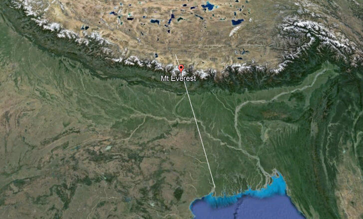 The first thing we need to do is get a handle on what Mons Huygens is being compared to: Mount Everest. If Mons Huygens' 4700m (say) is meant to be ‘just over half the height of Mount Everest’, the comparison’s being made with the height of Everest's summit above sea level, which is 8848m. But as Fig 1 shows, the nearest sea is 700 km away from Everest's peak, at the Bay of Bengal.