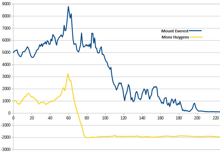 Fig 3 shows Mons Huygens' height profile against our horizontally truncated Everest profile. Notice that Mons Huygens' base isn’t on the lunar datum - the Moon’s equivalent of sea level. The base is 2000m below it on Mare Imbrium – the flat-surfaced lava fill in the Imbrium basin. Before the lava flooding in the Moon’s distant past, the mountain’s base would definitely have been lower than this, approaching the original basin’s depth, and so Mons Huygens would have been taller. Anyway, next let's shift Mon Huygens' profile up by 2000m so that its base is at the same elevation as Everest's. It just helps with the comparison.