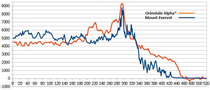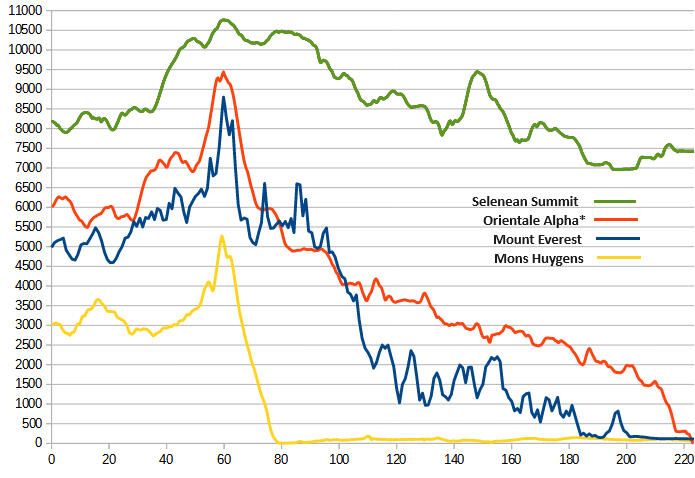 Right, from Fig 4 we can now just read off Mons Huygens’ base-to-peak height – it’s 5300m tall.As Fig 3 shows, if Mons Huygens were on Earth, it would only rise 3300m out of the sea. This suggests Mons Huygens isn’t really the right Moon mountain to be comparing with Everest. For a closer match, we should start with terrain that's already as elevated as possible from the lunar datum, not kilometres below it. That excludes the mountains around the Imbrium basin, including Mons Huygens. The lunar farside highlands however, is such terrain.So let's first examine the highest point on the Moon's farside highlands, and the Moon itself: Selenean Summit. At 10785m above datum, Fig 4 (green) shows its profile. In a sense, Selenean Summit is the Moon's 'Everest' due to its elevation, but Everest is a mountain and Selenean Summit really isn't; it's more of a plateau with a slope of between 3° and 5° from the surrounding terrain to the summit, making it unlikely to be ever designated a 'Mons'.But the next highest location in the farside highlands is a mountain. This peak, which I've just called Orientale Alpha, is on the outer south-west rim of the Orientale basin, and its elevation profile is in orange in Figure 4.