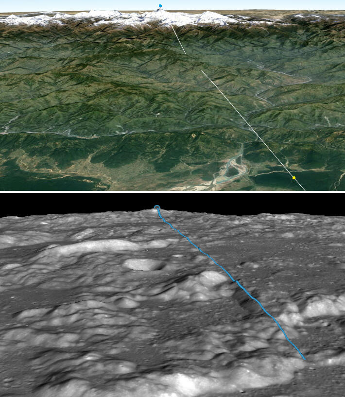 Fig 7 shows what Everest and Orientale Alpha physically look like, along the height profiles of Fig 4.In the top panel of Fig 7, we're looking east-west along the Himalayas. Everest's summit is highlighted by a blue dot. The white line traces out the blue height profile in Figure 4. The terrain starts rising significantly from the yellow dot, which is in the same location as the far right of the height profile.The bottom panel of Figure 7 shows the view towards Orientale Alpha’s summit. The blue line traces out the orange height profile in Figure 4, beginning at 0 datum and reaching up to 9460m.The top panel gives us familiar visual cues to help with perspective and scale—things like the forested plain where the terrain starts to rise, winding rivers, hills that step up to larger mountain folds, snow-capped peaks, and a plateau in the background. In stark contrast, the lunar landscape in the bottom panel feels completely alien. It’s all monochrome, with little variation in texture and no familiar landmarks to help gauge size and distance. For example, the crater above the center is 15 km wide, and the ridge to its upper left is 2500m high. It’s hard to even sense the upward slope from the bottom to top of image.If Orientale Alpha were in Everest’s place on Earth, it could potentially be less technically demanding to climb thanks to its gentler slopes and the lack of vertical faces, but the few extra hundred meters into the ‘death zone’ would make it considerably more difficult to summit.