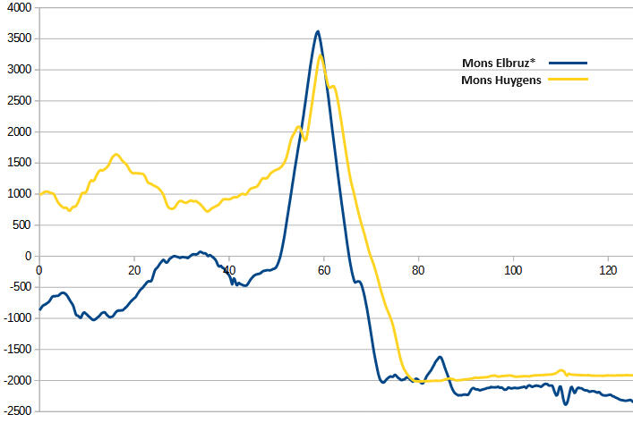 Fig 10 - height profiles of Mons Elbruz*, Mons Huygens (LROC Quickmap)