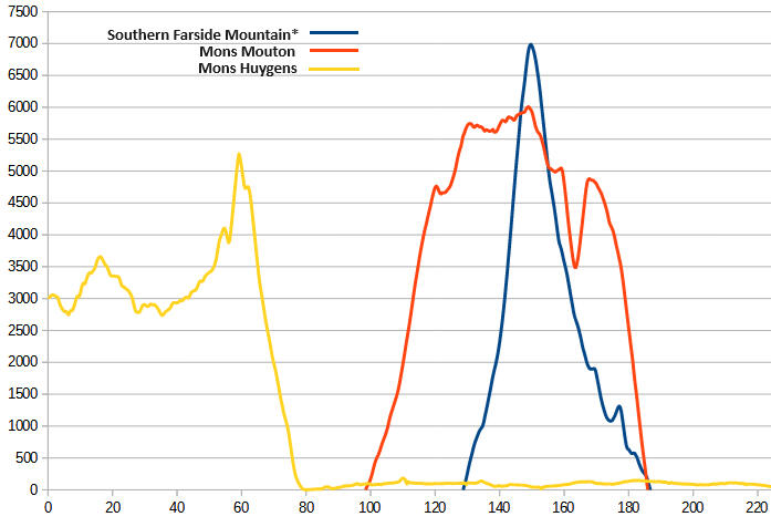 Fig 11 - height profiles of Southern Farside Mountain*, Mons Mouton, Mons Huygens (LROC Quickmap)