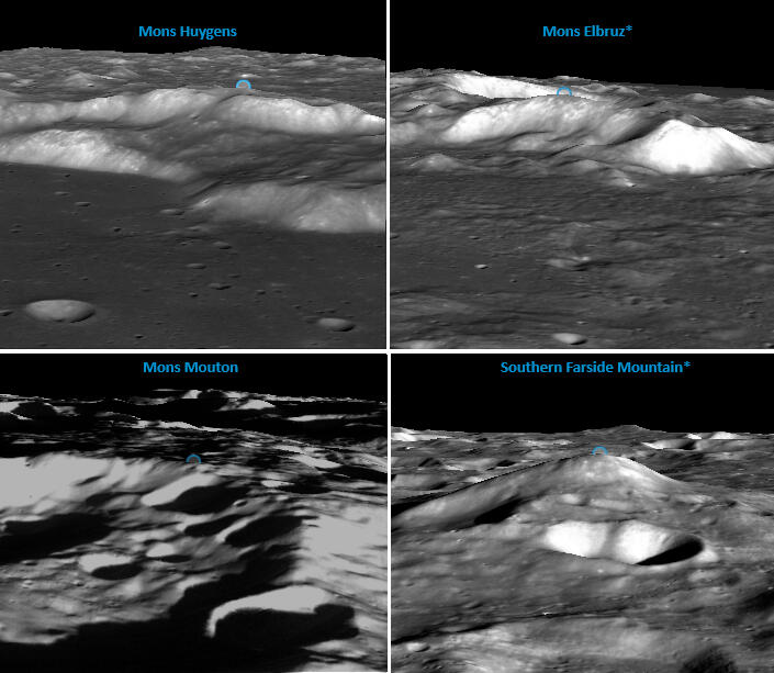 Fig 12 - 3D terrain views of Mons Huygens and three taller Moon mountains (LROC Quickmap)