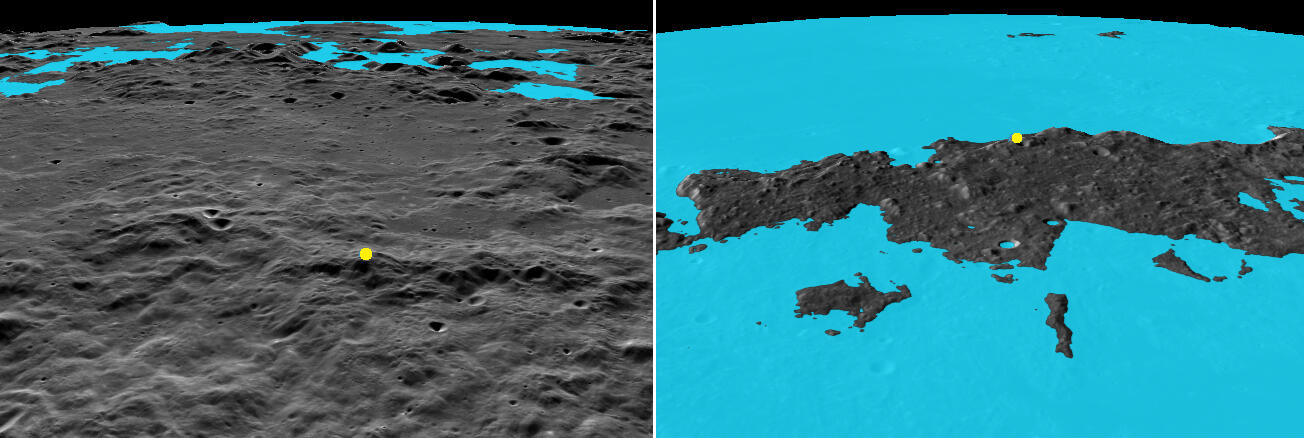 Fig 8 contrasts the environments of Orientale Alpha and Mons Huygens. Their peaks are marked by yellow dots. Here simulated water fills everything up to 0 datum, like Earth's seas. In Orientale Alpha's case, we're looking in the opposite direction to Fig 6 - from the peak back towards the Orientale 'sea', with the vast nearside 'ocean' stretching beyond. It's a 9460m drop from the peak to any point on the 'water's edge'. In the nearside 'ocean', landmasses are mere islands, like the Apennine range in the right panel that hosts Mons Huygens. Here nearly 40% of Mons Huygens' height is submerged.