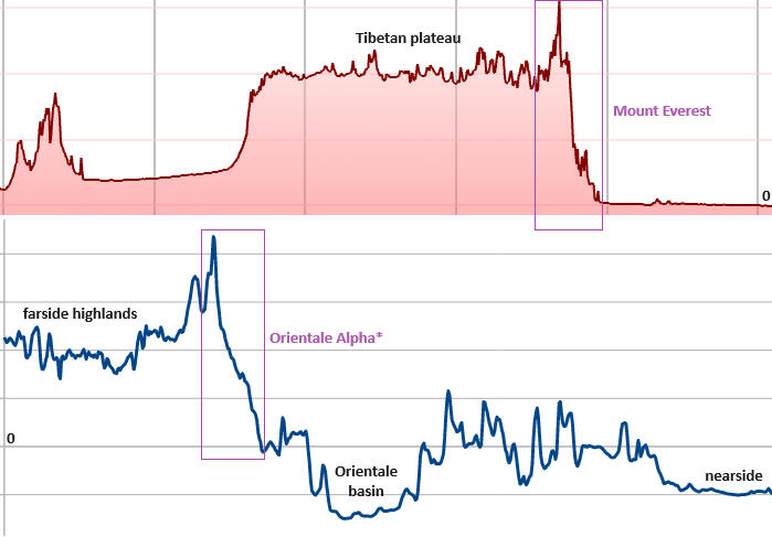 It's clear from Fig 4 that from 6000m to its summit at 9460m, Orientale Alpha rises with a similar slope to Mons Huygens. And overall Orientale Alpha's elevation profile looks uncannily like Everest's, only pushed up and smoothed out a bit more. So this truly is the Moon's Everest!Figure 5 offers a more zoomed-out view of the two mountains, and they maintain their similarity at this scale. Both the lunar farside highlands and the Tibetan plateau are at comparable elevations, with the respective peaks situated on their edge, and there's also some correspondence in the slope of the terrain down to near-datum from there.The even wider terrain profile in the bottom panel of Figure 6 highlights that the Orientale basin is situated at the transition between the thinner nearside crust and the thicker farside crust.