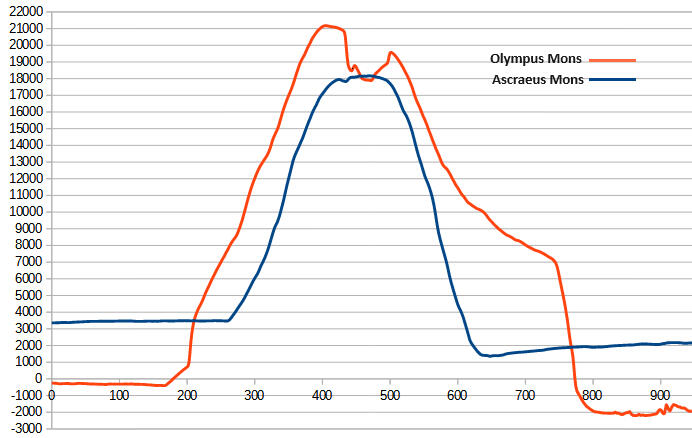 Fig 13 - height profiles of Olympus Mons, Ascraeus Mons (Mars Quickmap)